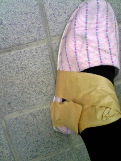 娘が、ガムテープでぐるぐる巻きに固定したスリッパ姿で帰ってきた。